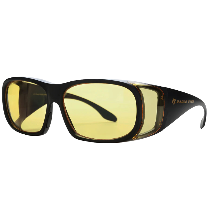 The Eagle Eyes FitOn Night glasses offer a practical solution for drivers who wear prescription glasses and need glare reduction during nighttime driving. These glasses are designed to fit over existing prescription lenses using durable Techlon™ Polycarbonate frames. The Night-Lite® optical technology uses yellow-tinted lenses to help soften harsh lighting conditions. The anti-reflective coating is designed to reduce glare from headlights, LED signs, and other bright light sources that can interfere with nighttime visibility. The lightweight construction allows for comfortable wear over prescription glasses without adding significant bulk. Available in both Black and Tortoise frame colors, they provide a straightforward approach to reducing nighttime driving glare for prescription glass wearers.