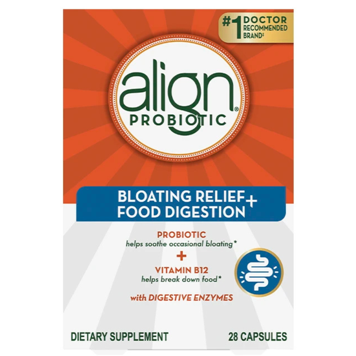 Align Bloating Relief + Food Digestion offers probiotic support for digestive comfort and everyday wellness. It contains the unique Bifidobacterium 35624™ strain and is developed by gastroenterologists, with the added benefit of vitamin B12 for food breakdown and five digestive enzymes. The product does not require refrigeration, making it convenient for daily use. Align is the #1 probiotic brand recommended by gastroenterologists for over 15 years and is backed by over 20 years of scientific research.